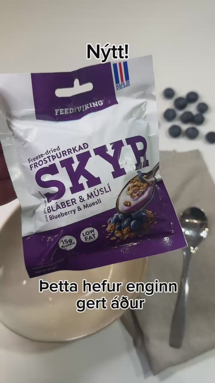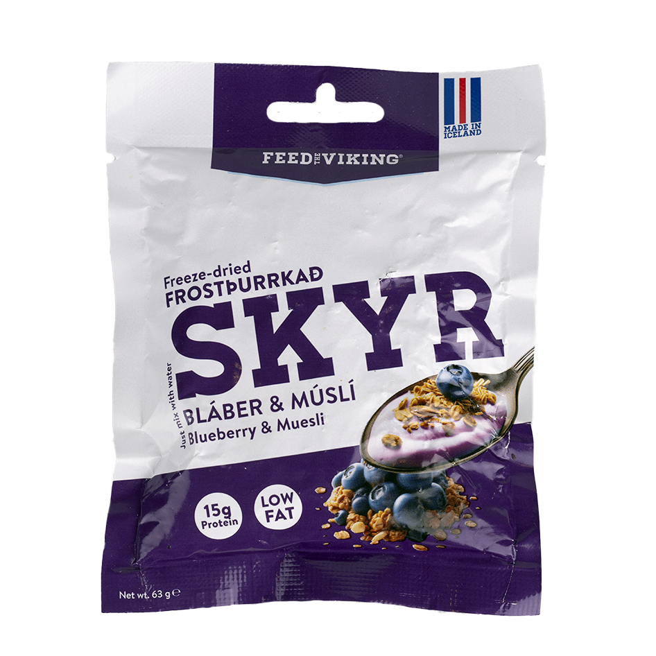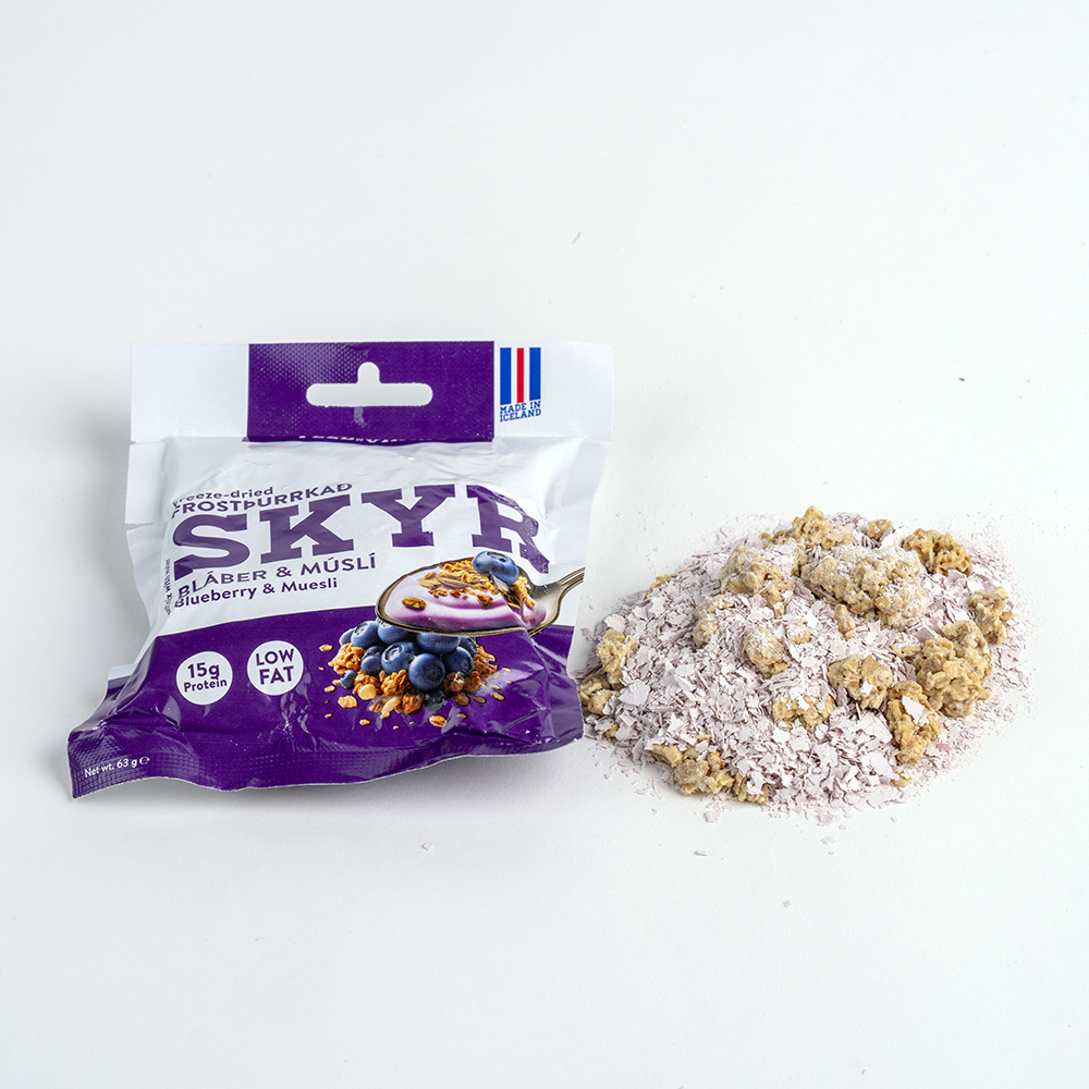 Síðan bættum við múslíi við í pokann – þannig að þú færð dásamlegt skyr með áferð og bragði alveg eins og nýopnað skyr úr ísskápnum... nema þú þarft ekki ísskáp og það geymist samt mun lengur.