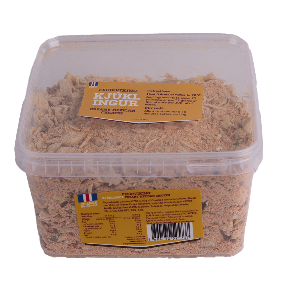 Hver skammtur inniheldur 60g blöndu af frostþurrkuðum, fyrsta flokks íslenskum kjúklingabringum, íslenskum kartöflum, súpujurtum, grænmeti, kröftum og kryddi.